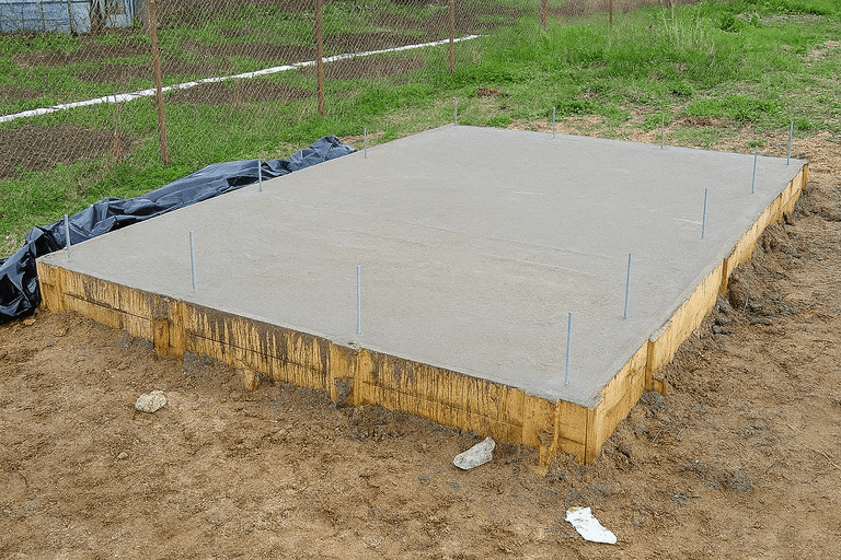 После затвердевания бетона убирается опалубка. Фундамент готов к установке хозблока.